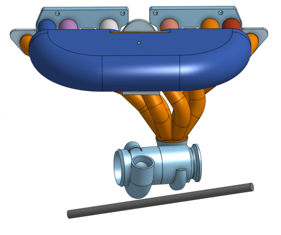 More updates on the turbo model. Turbine side is now much bulkier to match the drawings exactly, and the compressor outlet extends further out, which matches pictures as well as I could (no dimensioned drawings from the front face I can find), and also extended it towards the inlet a tad. I also added the dimension for the back plate ring for the compressor, though the front edge of that isn't "realistic" as it doesn't match that diameter in a full 360-degree ring, so if I can fit what I drew then I'm on the safe side. The turbo "slug" as I call it, now matches the dimension drawing from Garrett as identically as feasible, other than the cartridge area, which is of little concern to me. Also for those curious, centerline of exhaust outlet is 2.5" back from the manifold centerline, and the turbo is clocked 15 degrees. Alignment looks great, though I also know I need to go get some shock tower measurements... But hey, what's a hammer for anyways? Also, go figure, it's MUCH easier to run the downpipe when you toss in prefabbed dimensioned pieces and just rotate to fit right (kinda like real life, knock on wood). I used two 45 degree bends and getting it to fit is trivial, though it looks like the straight between the two bends could be swapped out for a 3" length (I used a 1, 2, and 3 inch straight as seen).