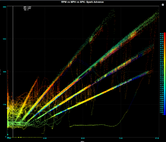 Feel free to send some logs my way to look at. I don't profess to be any smarter than other tuners, but sometimes someone will catch what others miss. Do you have any VSS or MPH logging? If so, then take a long spirited drive making sure to row through the RPM range in several gears. Then pull up the log in MLV and make a scatter plot of MPH on the X axis and RPM on the Y axis. I use spark advanced as my color axis, but doesn't really matter. Here's what my super sloppy dizzy wheel looked like: Notice the huge vertical distance traversed in RPM for a given MPH. What's more surprising, is when I select one of those entities, and then move forward and back through the adjacent log entries, it might be going from top to bottom of the spread during a WOT pull. That's a HUGE deviation and the motor itself is utterly incapable of undulating that much when in gear on the road. The only place that can come from is variances in the readings from the trigger wheel. Here's another way to look at the same "noise". Look at my RPM reading during a WOT pull: SOME variations are expected, and I thought maybe I just needed to turn the lag up on the sensor reading. Then I found some tune files and logs belonging to a LS2, which has a factory crank mounted sensor. The WOT pull was smooth as glass, and lag was turned way down to 10 in his tune.... That RPM signal noise isn't power variance from bad fueling or loss off trigger signal. It's simply slop in the trigger drive leading to bad commanded timing, which just ends up fighting the input to the problem. No amount of having stronger ignition will fix that what the ECU "thinks" is the correct commanded timing might be wrong. Way wrong. If you dig around you'll find that some people work really hard to remove slop from the system, and they likely fair a lot better than I did. But I say, sensors are cheaper than ever. Just get something crank or flywheel based and call it done.