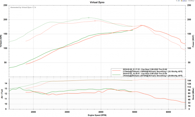 We need more activity in this thread, so I'll post my current status as I get my VE table sorted. I need to pull some timing from 3-5k still so power will drop in that region, but hopefully I can get some power back as I clean up the high rpm VE which was obviously off. Just following the rules, force it rich with your assumptions and base maps and sneak up on valid data from the rich end of things. Also, for those curious, the above vehicle data: Weight: 2400 (might be off, hope to get to scales this weekend and update with known valid data) Drag Coefficient: .48 (pulled from windtunnel test data) Frontal Area: 18.5 (pulled from windtunnel test data) Tire Diameter: 23.69 (running 205/60/14's) Gear: 3rd (1.308) Final Gear: 3.545 Dyno Correction Factor: 1 (not emulating dynojet or mustang) SAE Factors: (looked up using local weather data online, might not be exact but should be ballpark of accurate) Barometric Pressure: 30.1 in/hg Air Temp: 48 (I feel like I should use my IAT readings I was getting under cruise since my turbo inlet is in the engine bay, but meh) Oh, I guess I should include: Engine details: Turbo Block untouched (F54 w/dish pistons) MN47 head untouched Stock T3 Turbo Wastegate pressure (6psi) MS3X running sequential and D585 LS coils (full sequential, not wasted spark) Bosch Ford Blue 26lb injectors Factory Manifold Factory turbo elbow Edit: First off, let me apologize. Apparently I wasn't clear that this is a software dyno, based on megasquirt logs using "VirtualDyno" found here: https://barnhill.bitbucket.io/ If you frequent EFI tuner boards you'll find it used regularly, and like all dynos, it's best used as a run-to-run comparison tool, not a bragging right. Edit2: I got my car weighed, and I came in at 2280lbs. Probably light enough to cause as much debate as any dyno graph, but my car is gutted. No door glass, no dash, etc. I can probably get sub 2200 once I go with a fiberglass hood and plexi rear glass. And an AGM battery wouldn't hurt. So here's the same graph as above, but in 4th gear, along with timing and fueling tweaks. I pulled out of it early due to heavy detonation still present after 4k, which is likely also the source of the power loss seen. And as much as I'm thrilled to see the extra power... it's telling me I have work to do, as my target AFR is 12.5 at all RPM under boost. Back to the VE table...