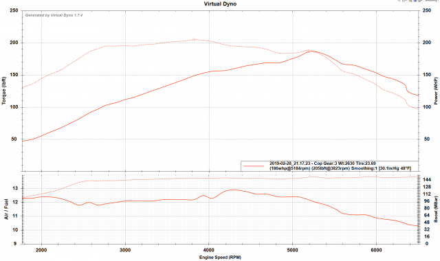 A bit of looking around and you'll see that it's definitely the most popular software Dyno out there, buy I also admit that's far from a testimony of safety or validity. What does speak to it's validity is the number of tuners who own dynos that admit to using it and finding it useful. The basic premise is no different than any Dyno. Only, a chassis Dyno has a known load on the dynometer side, while virtual Dyno needs you to give it accurate data for the opposite end, the vehicle side. The only logs it needs is TPS(tells it where the WOT run is to log off), MAP/Boost, and RPM. By giving it gear and tire size it knows your MPH and by giving it aero data it can calculate the wind resistance curve. With this data in can you simply plot the power it takes for acelleration at the logged rate, and you have power. This isn't much different than the phone app dynos, except those rely on good GPS data, which honestly is never fast enough. A 10hz GPS is required, though by 2025 that'll be a thing in most phones I think with the new GPS system rolling out. So phone apps might actually end up being more accurate soon anyway. I've had friends with a Dyno that only bought a Dyno to have a fancy paper for certain customers. Thier high end race customers who were competitive didn't care. Results are results. And how did they Dyno? Excel. They used their own custom estimator they built that would generate curves from logs, same as virtual Dyno. And guess what? When they got thier fancy AWD Dyno in the shop, the results were almost identical. They still preferred road dynoing thohgi. Know why? Becuase the results were more realistic to track conditions because it more accurately took into account aero effects on intake, cooling, and intercooling. Just some food for thought.