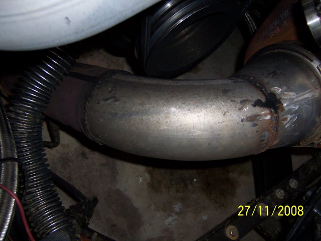 Yea I know it's dirty and there's oil on it. I haven't cleaned it since I last ran it. I'm doing the cosmetic work over winter break if I have time. The bend isn't as bad as it looks. It's smoothed out inside and I know the welds don't look the greatest, but they work. You can do it another way I thought of. Split(make a Y) the 5" into two 2.5 or 3" and run them on both sides of the motor. It MIGHT work but the Y will have to be almost right off the turbo. Have a Happy Thanksgiving.