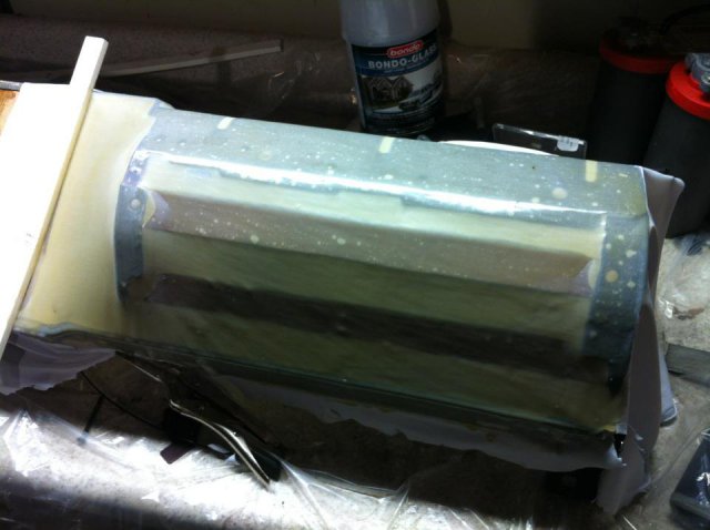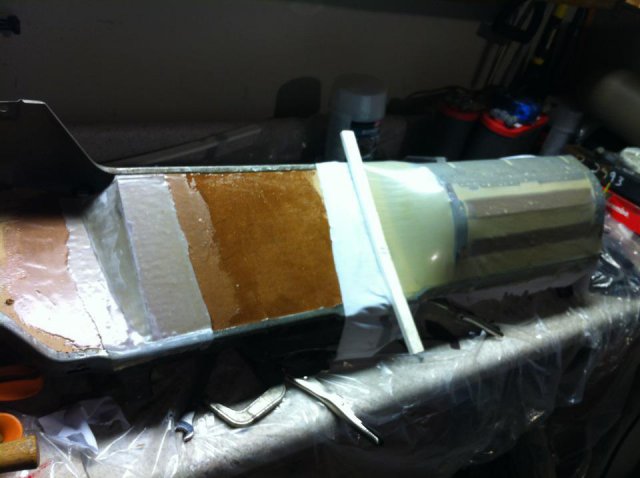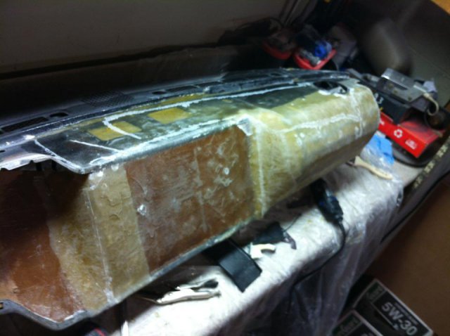 So I took the heads to another tech, who actually told me that for what I'm doing, the heads would do fine. Since I'm concerned about the frame being able to support the torque of the V8 that I'm putting in it, he said not to do all the head work until I'm installed the roll cage to support additional power. It looks like the valves are sealing properly now (put Maglight over the valve, saw no light seepage from the other side) so I'm really not that concerned about it right now. I started working on the dash finally, which has proven to be a little more interesting than I anticipated. I stripped the dash down and put in some MDF for a little structural integrity. Once I got the MDF in the frame, I started on trying to get the rough shape in fiberglass. The material I used was actually swimsuit liner I got from JoAnn's Fabrics. It wasnt very cheap (like $40 for 2 yards I think), but it was very elastic and was very good at returning to its original shape. I was mostly worried about the transitions between the 3 MDF sections (gauge cluster area, stereo/LCD screen area, and the glove box area). Since I'm not putting the glove box back, I just put in the horizontal slats to make an even curve over it, and bridged the gap between the glove box and the LCD screen area. I think the curvature that I got with the swimsuit liner worked very nicely. The vertical piece of wood you see was merely to put tension on the fabric, and was held in place by the large C-clamp you see that's partially obscured by the shadow. Once the resin hardened, I had to cut the wood/fabric away from the formed section and it held its shape flawlessly. Since I decided to make this car as light as possible and rip out ALL the non-necessities, the AC ducting was not necessary, so I covered up the holes on top of the dash with fiberglass mat, and began to apply the 3 layers of fiberglass to the existing frame. Some of the edges came out kind of rough, so I used a Dremel to clean up the transitions between the sheets and reduce some of the peaks that were left. Overall I'm very happy with how it turned out, and now on to the Bondo!