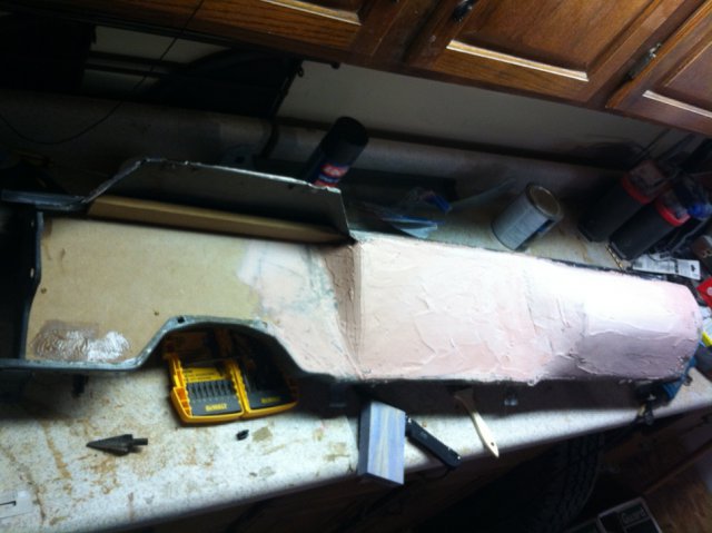 BONDO BONDO EVERYWHERE Before I applied the Bondo, I put the dash in the car to make sure it wasn't torqued all weird and would crack when I tried to install it. I found a few stress points, so I fixed them and patched it all back up. Then I started to go apeshit with the bondo and stuff, and managed to come out with some very encouraging work! After applying 3 coats, I sanded it down with 60 grit to see how close I was to putting a finishing layer on. I was surprisingly close, as I just wanted the Bondo to slope from the 1/4" ledge from where the original dash attached to the frame all the way down to the base of the frame. I'm still working on getting it perfect, but it's almost there! Finally, I got the curved part smooth as a babies bottom with 220 grit, and it's shaped exactly how I wanted it. I've yet to finish the gauge cluster third of the dash, so I've largely left that untouched. While I'm waiting on my gauges to arrive, I started working on the console beneath the dash, which will hold my touch screen and computer running it. I'll hopefully be seeing those gauges in the next week or so, and then finish up the Bondo! In the meantime, I'll likely be working on the console area and figuring out some way to mount the computer somewhere safe behind the dash.