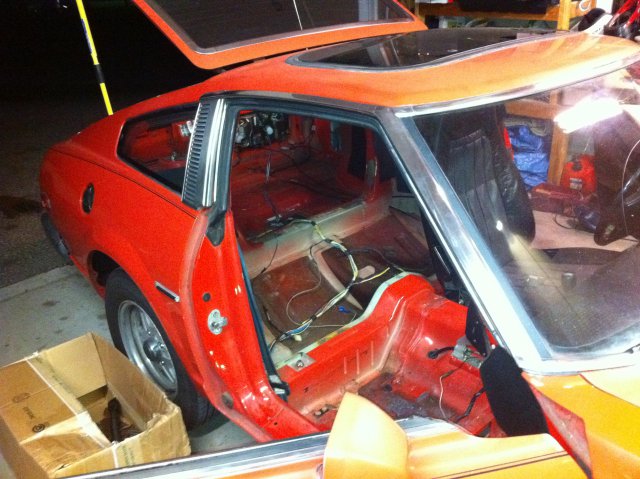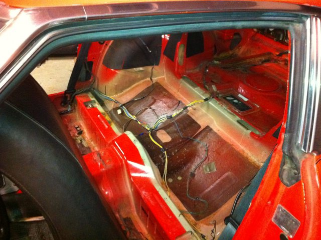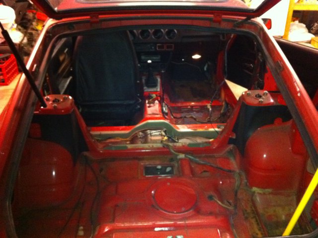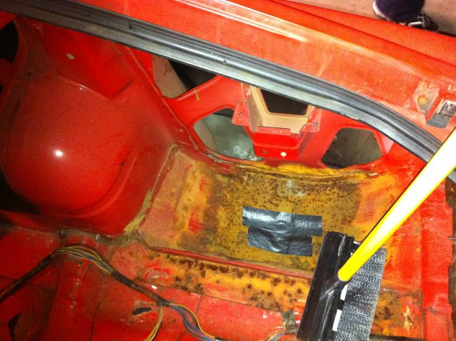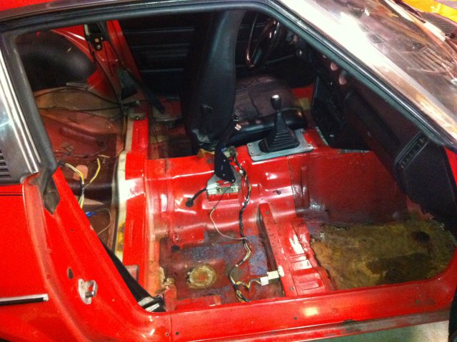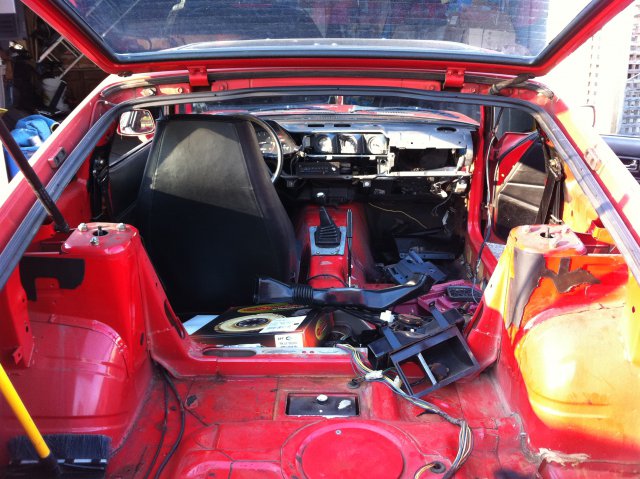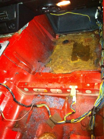 AND THE WORK BEGAN... First thing I did to the car besides SeaFoam and change all the fluids (car had sat for a while before I purchased it) was gut the interior. As to be expected, the sunroof leaked when it rained, and as a result the carpet was pretty much ruined, and I figured it would be good to go through the car looking for rust anyways. As you can see, I found some. I ripped out all the carpeting and tore apart the cracked dash to gewt everything down to the barebones car. I've since Ospho'd the rust and sprayed it with POR15.