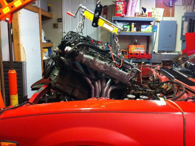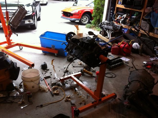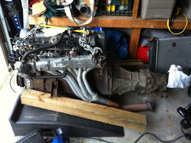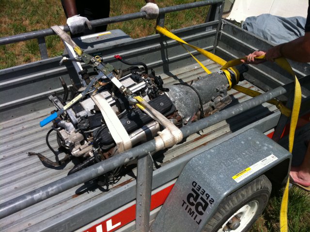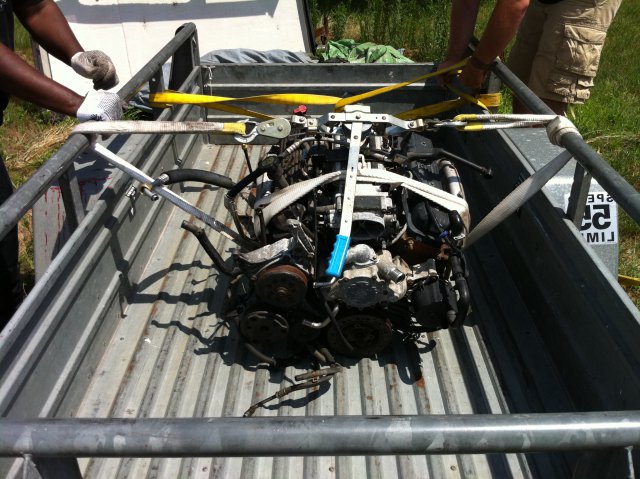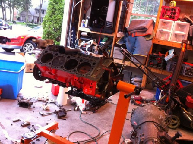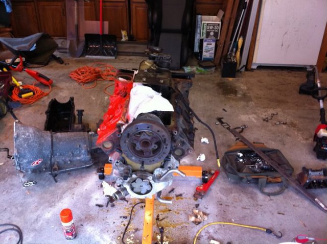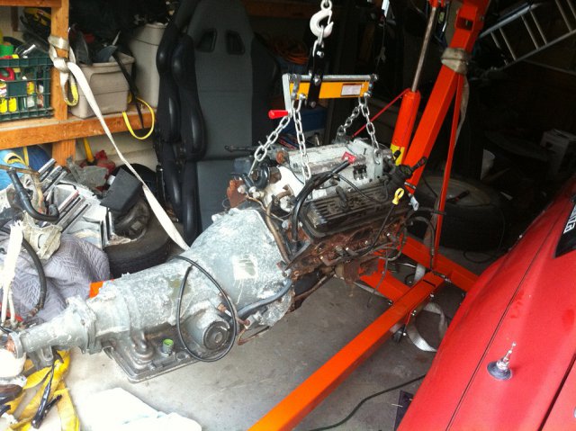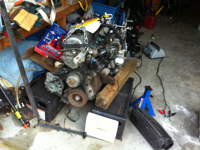 OUT WITH THE OLD AND IN WITH THE... SLIGHTLY LESS OLD? I was lucky enough to find someone who wanted to buy the motor/trans from me. So far, I'd upgraded the fuel injectors, alternator, clutch, fidanza flywheel, intake, and exhaust, and it still wasnt enough. The motor was very snappy and had lots of torque, but it felt like it wound out way too soon... I just needed more. So I pulled the motor and started looking for a new one. So I started to remove the motor, which surprisingly only took me about an hour. I love how once I got it out of the garage, the front end was riding ridiculously high... I just found it comical. I threw the motor on jack stands in the garage and waited for the guy (from Kentucky, actually) to come get it. In the mean time, I was searching for a V8. I settled on the LT1 because I wanted a motor relatively low mileage (aka used but not requiring a complete rebuild) and OBD-1 for tuning options. I was going to start with carb'ing the motor, obviously, but I wanted to be able to switch to EFI later if I so chose. So I found a guy in Delaware who had an LT1 out of a 1995 Caprice cop car with a 4L60E transmission who I talked into giving it to me for $250 bucks. It ran a year ago when he pulled it, but it had been sitting "in a shed" since then. I jumped on the oppurtunity, threw a uHaul trailer on my Subaru and booked it over to Delaware. Oh, need I mention, my radiator fans AND AC died on this trip, it was 105 outside, and my car was not happy pulling this trailer in that heat... but I digress. Pulled behind the guy's house to find that his version of a "shed" is a camper shell over 3 complete motors. I was a little surprised, but figured for the money, I can't ask too much of him. I loaded up the motor/trans and headed back for home. Since I'm smart, I didn't bring any supports for the motor, it was resting on the oil pan the whole trip, which ended up getting crushed. Smart me.