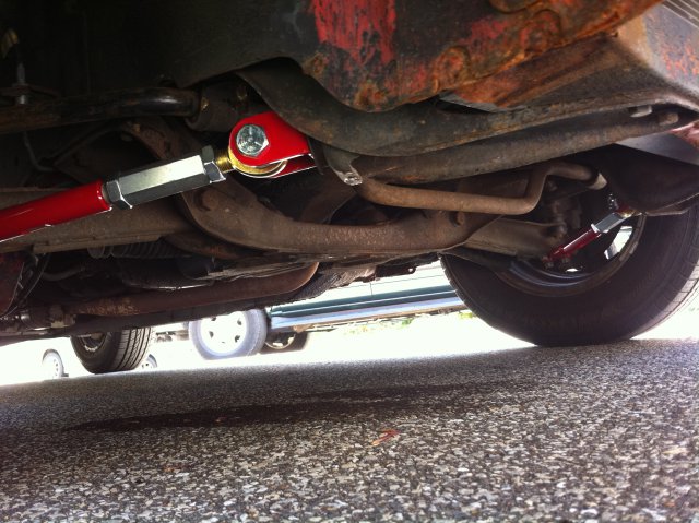 SUSPENSION UPGRADES... After I got the motor running good and the interior stripped, I wanted to work on some suspension stuff while I was waiting on the carpeting kit from MSA, and so I started by replacing the worn rubber bushing with poly bushings on the front end. Replaced the sway bar bushings, traction control arm bushings, and control arm bushings. Then I read online that the older traction control arms were bittle and could easily snap if used with Poly bushing... something I should have probably found when I did my research initially. So rather than lose my front end while driving down the highway, I decided to order a set of adjustable bomb-proof traction control arms from Techno Toy Tuning. These guys are great, very friendly and helpful! The stability and handling that I got from this upgrade was mind blowing. The car now felt like it handled on a rail, and it was pretty flashy to boot. So naturally, I figured I would have to take some photos and call it a day.