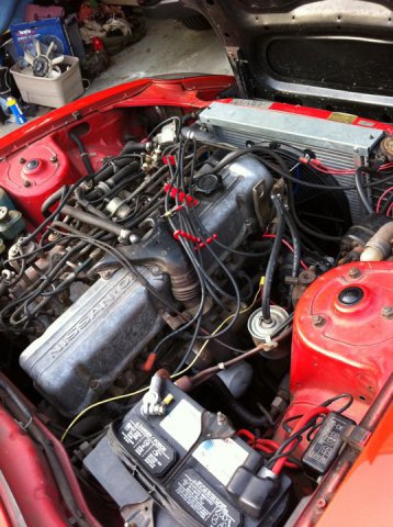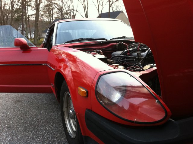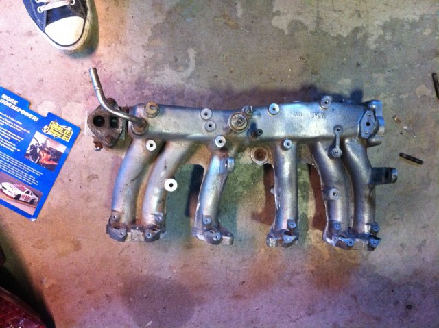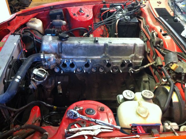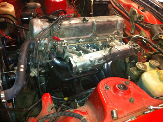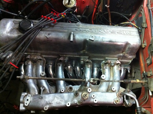 INTAKE AND EXHAUST... In order to get the car running really good, I needed to either clean or replace the old fuel injectors. In addition to that, I wanted a more aggressive sound and to clean up the engine bay, so I ordered the MSA 3-2 headers for a '78 280Z without the emissions provision and new MSA injectors. Since this is a MD car and over 20 years old, I don't have to deal with the nightmare that is emissions, so I figured it'd be one less thing to deal with. The old exhaust was rusty and already falling apart, so it turned out to be a really good time to do this anyways. Here are the Jet Hot coated headers, and here's the block as I was prepping it for the install. I got the MSA head stud/washer kit to replace the old studs and went to town. I know that the studs are in the wrong place in this photo, which I quickly found out once I tried to make up the intake and exhaust lol. Should have matched it up with the new gasket As you can see, I cut out the webbing in between the runners on the intake manifold, and cleaned them up and blocked off the EGR from the intake. Got it all together, and then installed the new injectors on the fuel rail. I didn't have the forethought to get any pictures of that, but those are all new injectors and I painted the fueld rail. It fired up right away and ran good until the fuel pump conked out on me. At which point I felt that I couldn't justify putting more money into the straight 6 when a V8 was calling my name... enter the LT1.