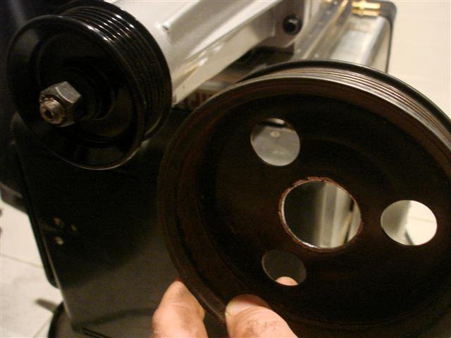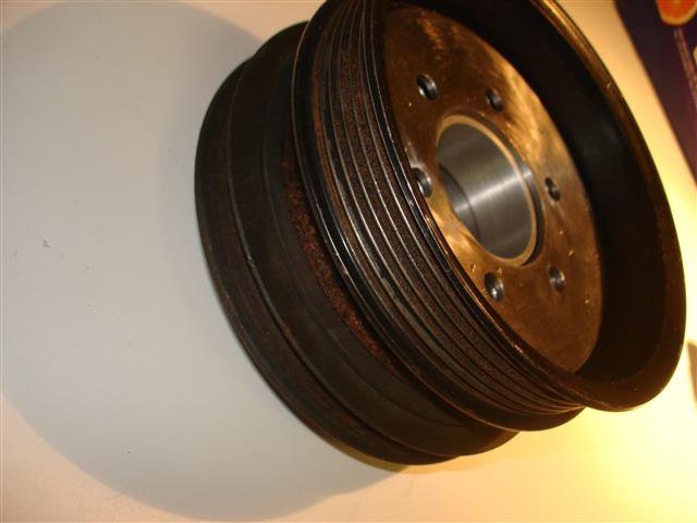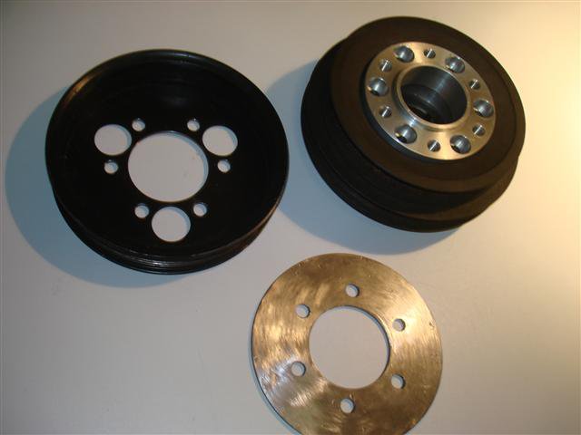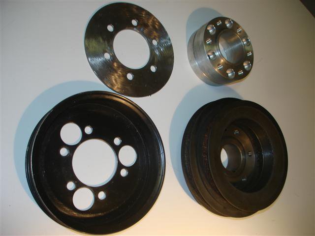 18. It has been over two years in the making but I'm moving closer to a finished LD28/P90A supercharged L6. The plenum is in the works at a local metalsmith. It will bolt up to Justin Olson's intake flange. The Laminova water/air aftercooler is finished and will sandwich between the plenum and M62 SC. That brings me to the crankshaft pulley. I labored for a cost effective means to procure a pulley without machining one. What I came up with should fit the bill. The stock two pulley damper will be machined out slightly to provide a uniform smooth inner bore and drilled in a six bolt pattern to fit a cylinder shaped plug (it then goes to damper doctor for an overhaul). That plug will sit flush with the surface of the outer pulley and have a protruding step to provide a hub for centering the 6-rib pulley. I'm using a reworked GM 24500426 power steering pump steel pulley. The center shaft sleeve was pressed out and then I pressed the whole center section flat in my press. It needs to be chocked in the lathe and turned to open the center uniformly and drilled to bolt to the damper. Another thin spacer will sandwich the pulley to provide reinforcement. It measures 17.125 around the ribs. The SC is 8.75 giving a 1.957:1 ratio. I think that should provide about 8psi boost. This has been a long expensive exercise in frustration. I'm thinking I'll have to push the engine back 1" and down about .5" to provide clearnce for the SC belt/pulley to fan and account for the .75" additional height of the LD28 block (note the V07 casting number in the engine photo).
