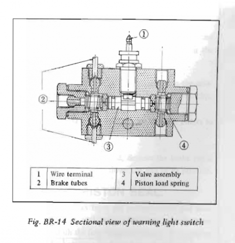 Here's a picture of the older switch. I really don't know how the older ones work, I've just seen that they need to be reset if they get tripped. Maybe they have a tendency to get stuck? My 76 had the switch and it fixed itself as soon as I fixed the problem (calipers on wrong sides). The OP never said what year car he's working with. -
