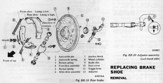 Rear brake drum spring woesNewZed replied to rickyellow zee's topic in Brakes, Wheels, Suspension and Chassis Put the shoes and springs together off of the backing plate, on a bench or the floor. Fold the shoes toward you like closing an open book, keeping the springs in their holes, using the springs like hinges. Place the various contact points of the shoes and mounting areas of the backing plate together and push the shows flat like opening a book. The springs will stretch as the shoe ends get pushed apart. Use one hand or a helper or a rope or string or bungee cord to hold them in place while you insert the pins from behind and lock them down. Can't remember but I think that you might be able to mount the adjuster between the shoes after the shoes are mounted, or hold it in between the shoes before you place them on the backing plate. Anyway, if you try it, the fine details will fall in to place..
