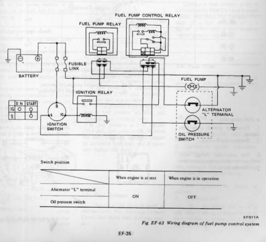 Most important - did the engine start and stay running? Put everything back together and just use starting fluid. You're kind of mixing variables, and jumping to hopeful conclusions. Your description is a little fuzzy also - the whole car clicks and hums? In the on and the off postilion? Can't understand. Could be that the click is a relay and the hum is the fuel pump. That would be normal. Also, you might have actually jumped the pressure sensor side of the switch connection. Pretty sure that the way to bypass the oil pressure switch is to just disconnect it. It's open when the engine is running, I believe. It's a flaw in the design. The diagram is hard to understand since Nissan says "On" instead of "closed", but I've seen others describe disconnecting the switch to make the pump run when the key is On. Just pull the connection and turn the key to On. I could be wrong. I have a 76.