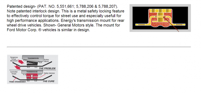 The GM rubber mounts will fail catastrophically in tension. ES addressed that problem. The tension that they see in this application is inertia from big bumps, and deceleration while in gear pulling the diff nose down. Could wear out the urethane, but the metal interlock controls the damage, In theory. Seems pretty smart. http://energysuspension.com/products/Transmission-Mounts.html