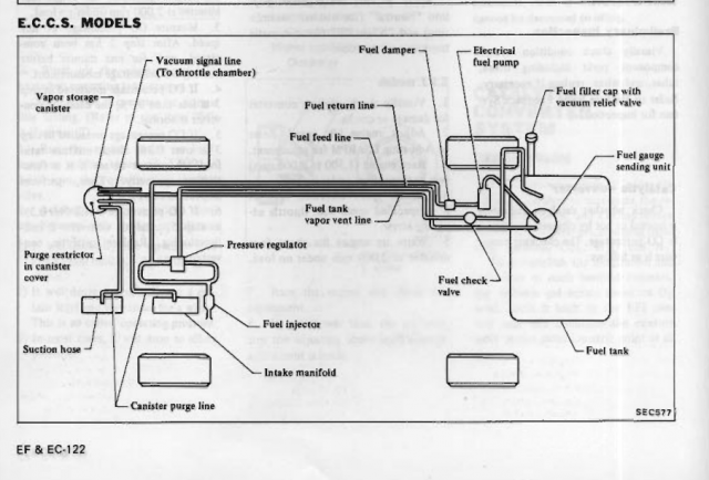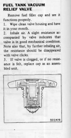 That's different than a 280Z's. But that's what "vacuum relief valve" means on the diagram I attached. If you have a mighty vac you could probably rig something up to see if the valve opens. Or if no one is looking you could suck on it, procedure described in the attached picture. By the way, all of these pictures come from the final few pages of the 1983 EFEC chapter.