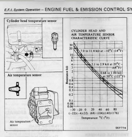 Testing the CHTS is super simple, it's not even hard to reach like on the thermostat housing mounting position the 280Z use. It's right there. There's a chart of resistance versus temperature in the FSM. There's a lot of other info in there too. At least you'll know if you have the right one.