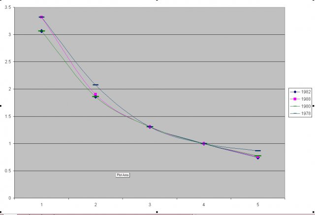 Thanks for the feedback! I've seen your comments on the atlanticz site pallnet (one of the first as far as I can tell), and been through your writeup many times Nigel. I almost have the procedure memorized. I went over to 240SXforums.com and downloaded some FSMs and they show the dual cone 2nd gear all the way back to 1989. The first dual cone appears to show up in 1988 in the 300ZX, which opens up the range for improved synchros. Haven't found any information on the wider gears yet. As for the shorter gears, the C transmssion has about the same first gear ratio as the early 77-79 boxes. So my 3.54 gears should work well, I would guess. I'v attached a little Excel plot I put together just to visualize the ratio differences. Still interested in comments or information, from anyone interested. -