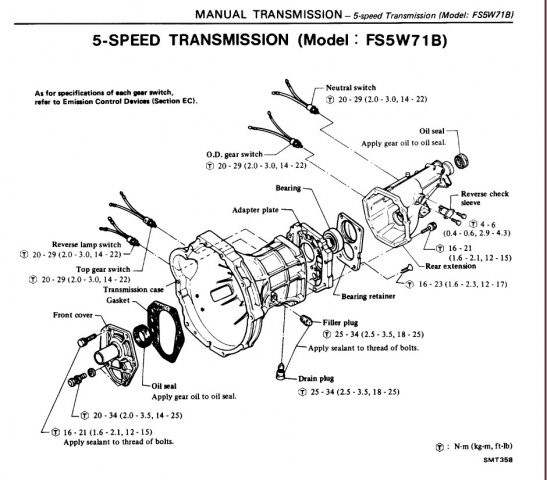 Does it look like the attached picture? That transmission uses 80 to 90 weight gear oil. It's the common Datsun 5 speed. The drawing is from the 1982 FSM. The shifter mounts in the cylindrical piece on the top of the tail shaft.
