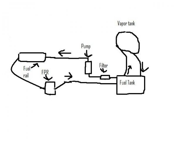 s30red240z has a good point. Maybe you are not getting enough current through the injectors to open them. Or you might not be getting a proper ground through the ECU (same result). Then injectors are powered all the time when the key is On and open when the ECU grounds the circuit. If you have a spare injector, you could plug it in, in place of one on your engine to see if it is opening. s30red240z suggests holding it in your hand because then you'll feel the click as it opens. I recently cleaned my injection harness connections and put newer injector connectors on and now can actually hear the injectors clicking open when the engine is running. Before then, they were barely audible. Your FPR is designed to flow fuel through the rail all of the time. The orifice to the return line gets bigger or smaller to maintain a 36 psi difference between the inside of the manifold and the fuel, but it is always open when there is enoguh pressure from the pump. So if you don't have fuel in the return line, something is wrong. You could pop your CSV out and hit the starter to see if fuel is actually getting in to the fuel rail. Follow your fuel line from the fuel filter outlet through the rail, to the FPR and out to the return line and you'll see how it works. By the way, sucking gas fumes through a shopvac doesn't seem like a good idea. -