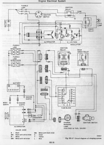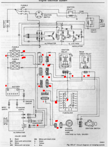According to one diagram that I have that is the L wire, for Lamp. It supplies power to the alternator windings. That would explain your problem. Now you just have to find out why it doesn't have power. Nissan made things complicated in 1978 with lots of extra relays and gizmos. I think that the best you can do is to follow that wire back. Looks like it gets power through a"check relay" (maybe your e-brake warning light) and also the Charge lamp. The Charge lamp in the meter should light up when the key is on. The colors aren't right in my copy of the 78 FSM but it shows the various connectors. Maybe you just lost a connection. Edit - looks like they only mislabeled the color, WB, right at the plug. It's back to "L" (blue) farther down the circuit. It does indicate a splice to a yellow wire along the way. Nissan used a crimp on to exposed wire to create branches. Likely a stressed point, susceptible to bending and fatigue. -