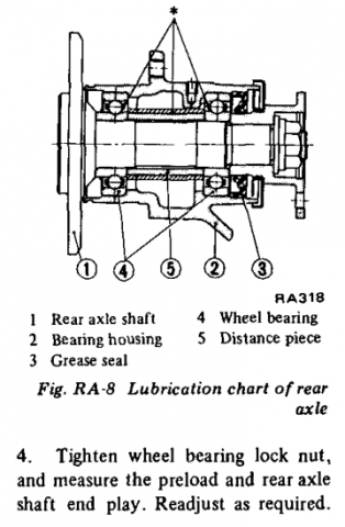16. Nissan has several adjustment procedures in the FSM that can conflict, then they don't have specific "readjust" instructions. The rear bearings are pretty simple, you're just clamping a spacer, the "distance piece", between two bearing inner races. Unless the distance piece is thought of as crushable, there is no adjustment possible. The parts are all supposed to be measured and fitted before installation, then torqued, and that's about all you can do. Are people confirming that their distance pieces are parallel on the ends, and the bearings are seating properly? A little tilt would put a lot of leverage on the shaft end. There are five surfaces that need to be parallel. Just some things to consider. Edit - one more thought. If it was mine I'd assemble the stack of two bearings, the distance piece, and the nut together outside of the hub as a quick check of specs. If it's close to right there won't be any gaps. If it's not you'll probably see something. Could be the threaded ends are cut off-axis, which would put the nut off.
