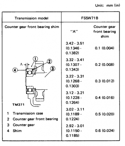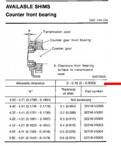 If I recall right the shim contacts the bearing and the A dimension is how far the bearing sticks out. You're not shimming the cover, creating a gap, your shimming the bearing race to get a certain force. So the shim is meant to apply force to the bearing race, to keep it in place after expansion of the case. So, in your situation, you'd have a little extra force on the bearing race because your bearing is sticking out a bit far. Maybe give it a few more taps and see if it drives in farther. Might solve the dilemma. Otherwise, I think you'd actually want a thicker gasket. But that might affect your other dimensions. I've read that the racers often run a thinner shim to get more force on the counter bearing, to keep it in place when the transmission is really hot and expanded. Food for thought. That's how I remember things from back when I put one together. I could be completely wrong in my thinking. I also have a book on rebuilding transmissions and seem to remember some good info there too. From 82 ZX...