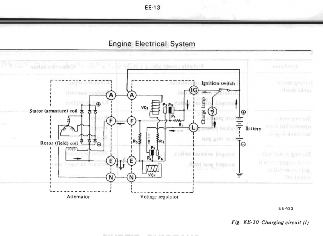 People don't seem to be reading each other's posts. My images were from what is supposed to be a 1975 FSM. I've seen discussions about whether it actually is in the cars. It might be that Nissan used old images but never put the light in the early Z's. Even the 1972 FSM shows a Charge lamp, and it has an ammeter. I suggested that the Charge lamp might be burned out also. Maybe Charge lamp and Warning lamp are not the same. Who knows. In the 1972 image they call it a Warning lamp, see below, in 1975 they call it a Charge lamp, see my previous post. Your image is from the models with a "starter interlock", and they've cut out a portion of the diagram. The arrow starts from nowhere. The ones I inserted show the circuit back to the ignition switch. They all go to "L" on the voltage regulator though. "S" is typically connected directly to the battery positive, at the starter lug, where the positive cable attaches. If you attach L to S there will be a constant draw on the battery, through the windings. That will probably drain the battery. Whatever you decide to do, use your meter to confirm that you have power on the wire. -