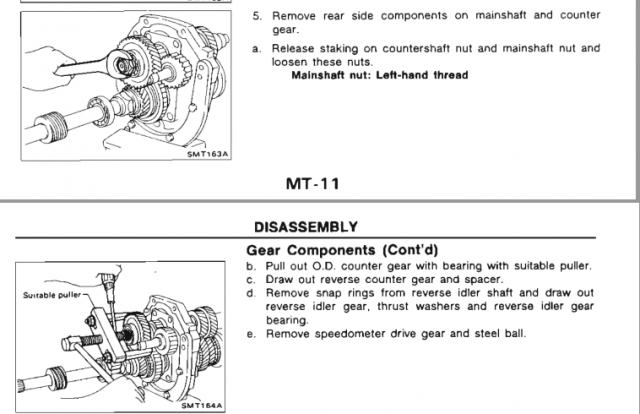 You can see the clip to let the idler gear free. Find out how to get the fifth gear removed to let it come off the shaft. Might be shown in the manual, MT chapter. Looks like you can pull 5th and change the idler then put it all back together. Get a new nut before you start, you'll probably destroy the old one when removing it. http://www.nicoclub.com/archives/nissan-240sx-factory-service-manuals.html Try a more descriptive title of your thread also if you want to get some views. "Reverse idler gear" doesn't really draw the eye.