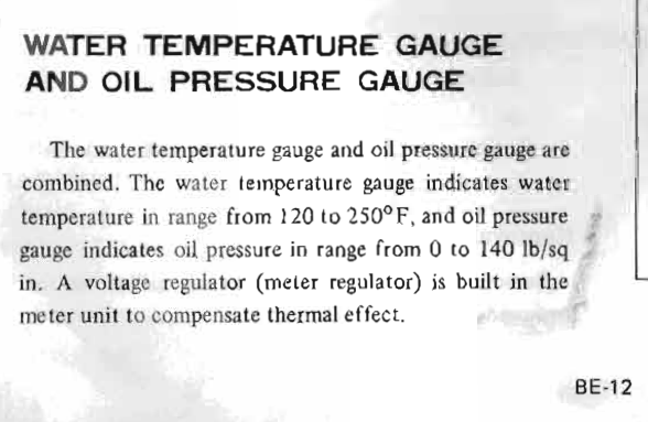 How complex are the stock temp and oil pressure gauges?NewZed replied to rundwark's topic in S30 Series - 240z, 260z, 280z I think that the later service manuals might mention that if there's a problem it could be a bad voltage regulator. Think I've seen it in the 280Z FSM's. If both needles go wacky at the same time it's likely that, you'd think. Picture from 1973 FSM.