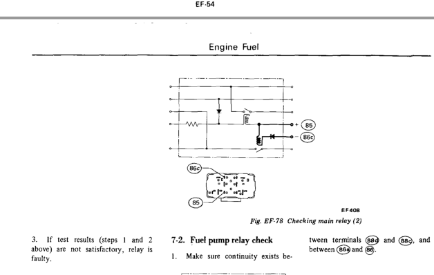 Weird no power to fuel pump 280z 76'NewZed replied to ericp501's topic in Trouble Shooting / General Engine You had a good clue with the relay clicking when you opened the flap. Follow the power. The AFM switch must be working, that's one. The relay clicks, that's two. If the contacts in the relay are closing, power should be supplied to the pump through the relay. Get in to the wiring diagram and follow the wires back to the pump from the relay. There's a connector right next to the passenger seat that carries the power back. Since you know you have the AFM and AFM power in to the relay working, and you know the pump works, check the relay itself if the wires back look right. There's a procedure in the EF chapter. You'll need a meter. Make sure that power is being supplied to the relay to run the pump. There might be a fuse, can't remember. You can also disconnect the wires by the passenger seat and supply power there if you're careful, or check continuity back through the pump motor. Break the chain in to parts until you find the broken link.