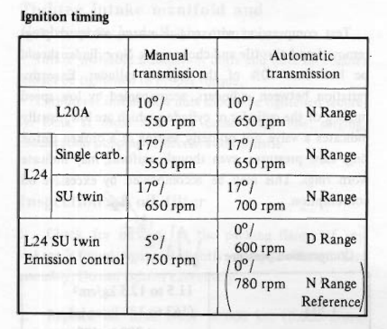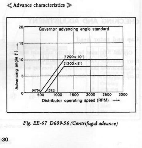 That would be the end of advancement, not a switch. Sloping upward from the base setting as RPM increase. 4000 RPM seems high for the L6, most of them are done by 2500. Since you have a timing light you should just characterize what's happening. Set the base to some low number, then rev the engine until it stops advancing. Note the timing and the RPM. If you don't have a dial back light you can set timing to zero for a short while and rev the engine until advancement stops. Then you'll have the centrifugal advance amount, which you can use to set base timing. Here's an example of a timing curve. It's in distributor RPM, not crankshaft so you need to double the numbers to use them at the crankshaft. So advance starts at 1000 RPM (500), and stops at 2400 (1200), with a total of 20 degrees (10), for the first curve. So, if you set your base to zero with that distributor, to characterize it, it would stop advancing at 20 degrees on the timing mark, at 2400 RPM. I'm not sure which distributor goes with which carb setup (there were several combinations in 1972), but there are other curves in the FSM. Read Engine Electrical and Engine Tuneup if you want to see the possibilities. They have high centrifugal advance for low base timing, and low centrifugal for high base timing. Generally, they limit total to the low 30s. Most guys on this forum shoot for about 34 total.