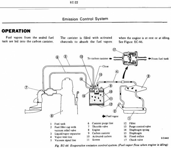 Nissan did essentially the same thing from 76 to 95. Lost the liquid/vapor separator or incorporated it in to the tank by 95. Some hose, a check valve and a carbon canister, plus the correct fuel filler cap, and you should be able to rig something up. There was a thread a while back about how the newest cars have a pump to the tank to pressurize it, the tank itself not the fuel line, to a certain low level. Thought it was crazy, but it's true. Could be the for anti-cavitation as Tony D described. Edit - actually it appears to be just for system-checking. But, who knows for sure. http://www.obd-codes.com/p0453 Diagrams from 76 and 95, 280Z and 300ZX.