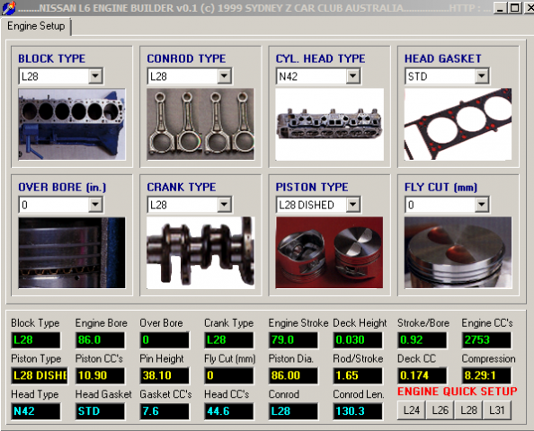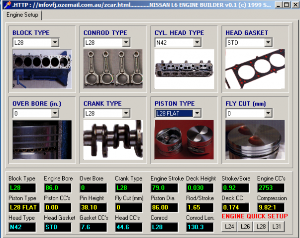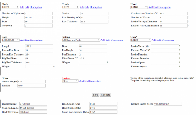 Seems to give very close numbers for the stock configuration though. Implying that the calculator equations are correct. 280Z engine, dished pistons, 1.25 mm HG, 8.3 CR.