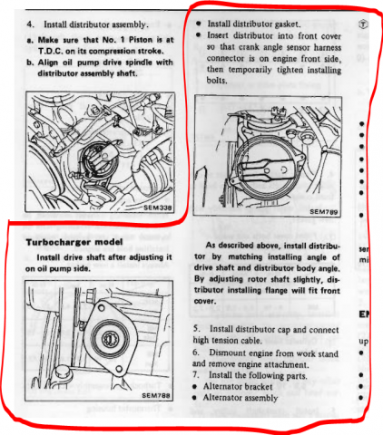 If you're using the CAS you were working on in your other thread, the ECCS controls spark timing. So when you set the CAS and distributor up according to the FSM, rotor-phasing should be correct. The only way you could change your phasing would be to rotate the CAS disc, which is not possible without modification. You have a stock ECCS system right? Nissan computer, CAS, etc.? I'd do what the factory says to do. Sorry to keep jumping in to your thread. I'll butt out if you want to hear from the turbo guys.