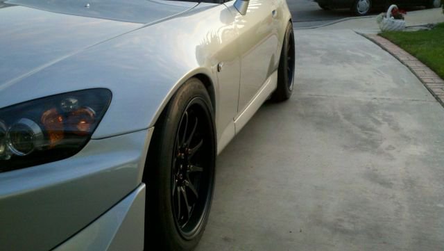 No tires yet, everyone is back-ordered on the ones I want so I'm just waiting to see which shop gets them in first.... I haven't ordered spacers yet, so in the pictures they are just mocked up against the studs. You might be able to get away with a 1.25" in the rear and 1.5" up front if you're running coilovers. That would give around 5.1" and 4.9" backspacing respectively. -