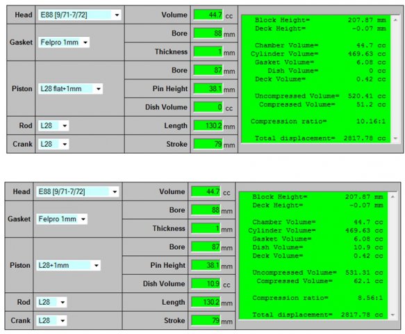 6. We get 91-93 octane here in Florida and this is a weekend car so gas is not an issue. Attached is the difference with the online calculator. It is just a base starting point, with a 1.27mm gasket drops to 9.88CR. I have friend that did this build w/ stand pistons and it is very strong.