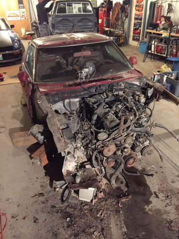 Engine I'm looking to refresh is an '82 l28et /w a F54 bock and P90 head. Upon first inspection at home, the timing guide had snapped off half way. Cool. Neat. Great sign of things to come. The previous owner was obviously clueless. So I proceeded with caution. The spare engine /w donor car had been sitting for a while. Totally seized up. Spare parts are great though. It ended up being easier to tear the engine out than lift it out. When in doubt, use a bigger hammer. So I used a combination of elbow grease, sawzall & skid-steer.