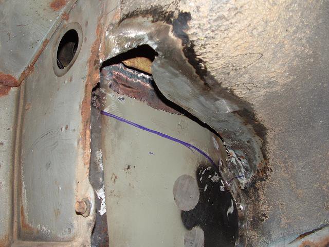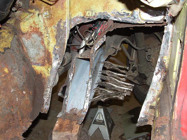 Working on the car. Firewall gone. Firewall fixed. Battery cut out. Battery fixed. Frame fixed. Floor cut out.