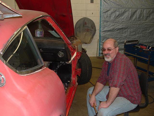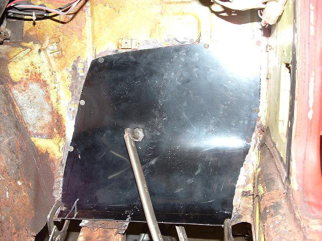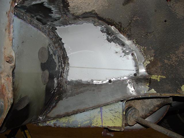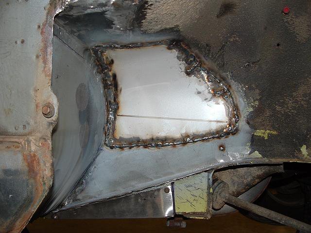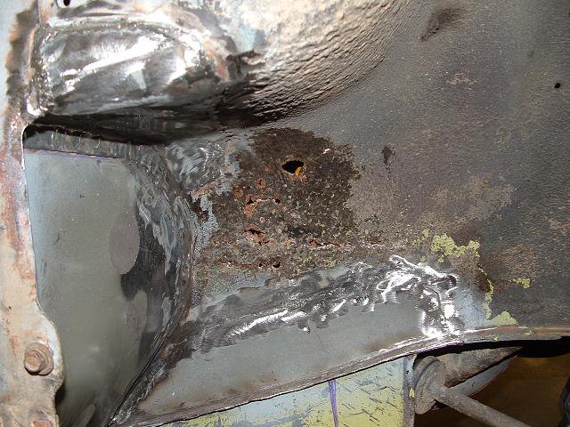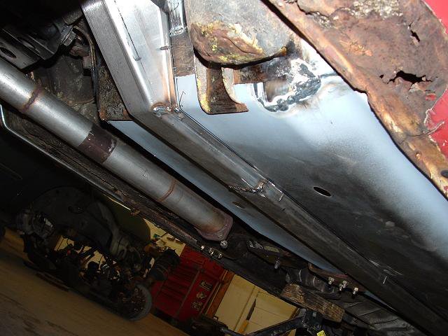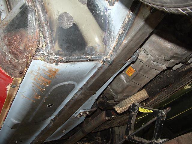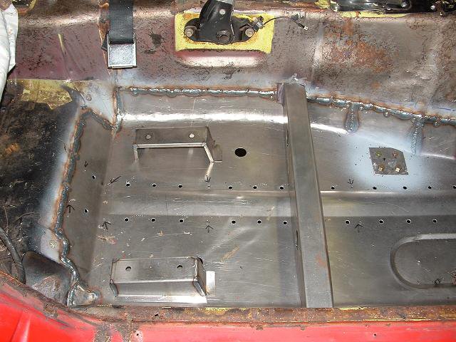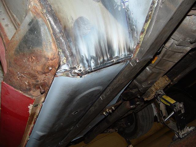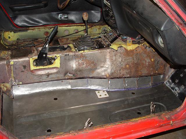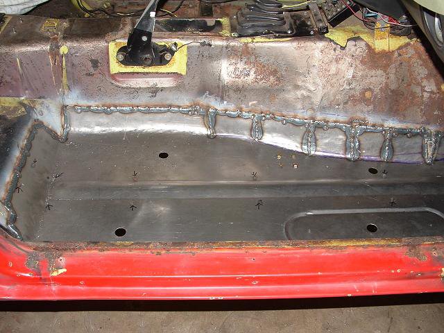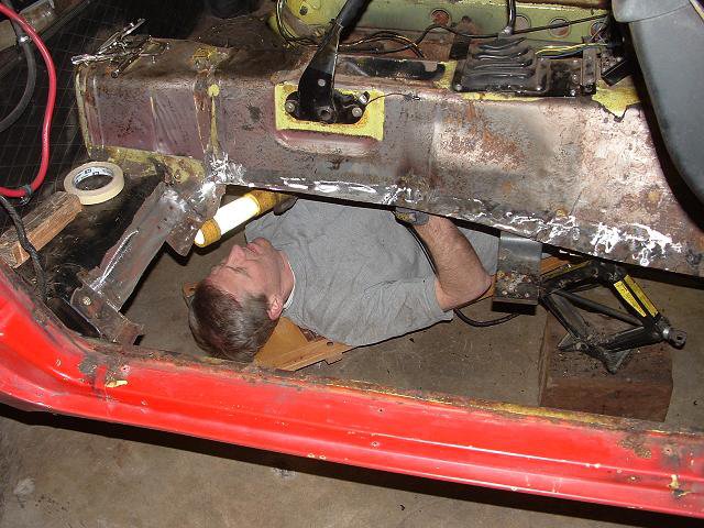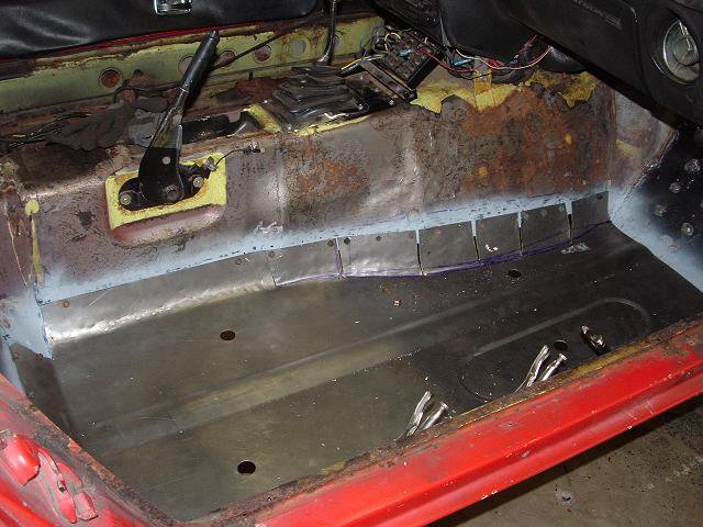 Found some more rust. Another patch. Welded in. We had to reshape the floor to fit the transmission tunnel with the T56. Kieth the bodyman doing the work.
