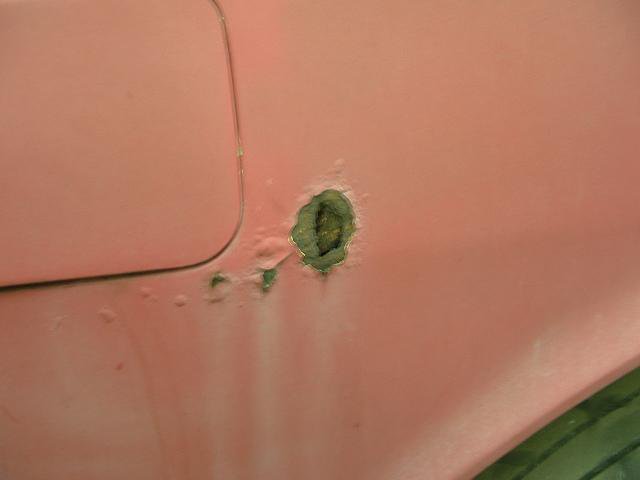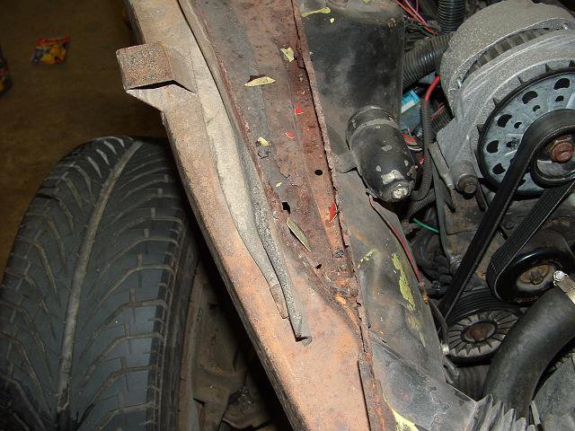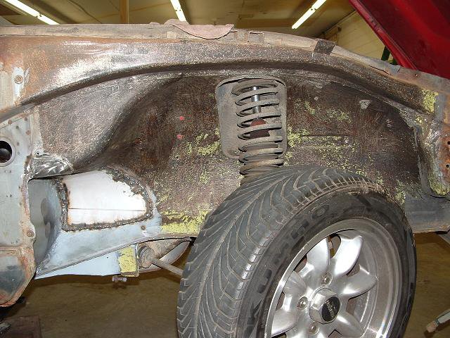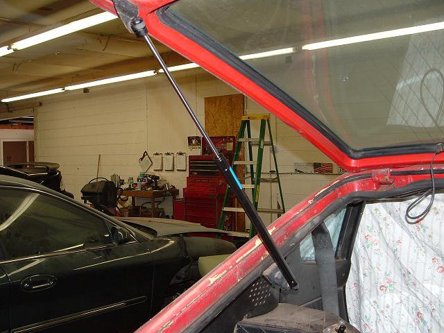 Scraped the undercoating off one wheel well. Holes drilled for new frame rails and seat bracket installed. New $18 hatch strut installed.