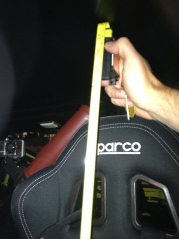 If you ever find yourself in or near Atlanta, feel free to let me know! I'll be happy to take you by the shop and let you check her out. Heck, pick the right weekend and you can go for a ride-along or two at a local event. In the meantime, it looks like you've got 35-36 inches, give or take, from the bottom-most point of the seat to the roof: