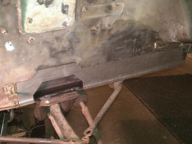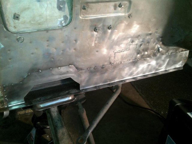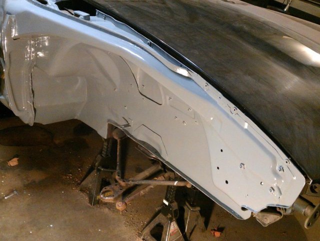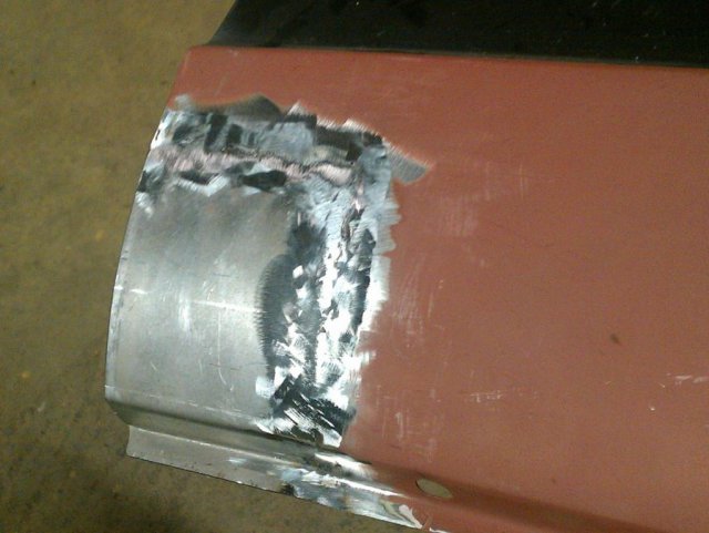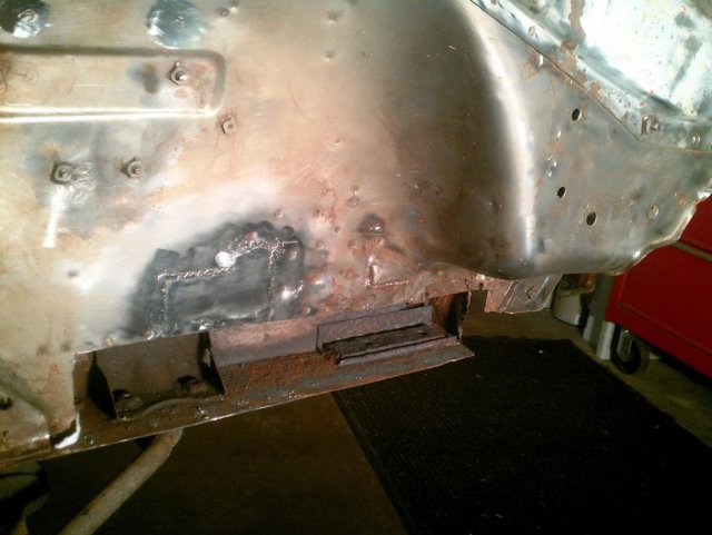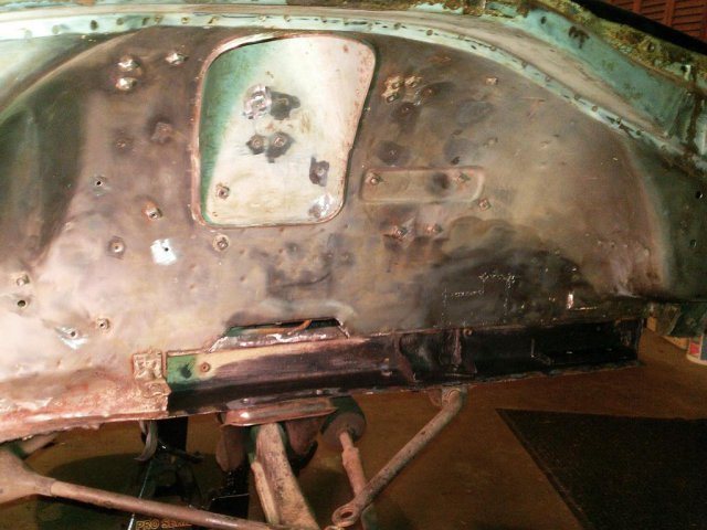 I spent the weekend installing the rust replacement panels I made. In this picture this panel is just tack welded in. I did get the panel completely welded in, it just took time to do it right. Now I just have to grind smooth the welds, clean up the wheel wheel and get the area primed and painted. As soon as I get the area cleaned up and painted, I will post some more pics. -Dave
