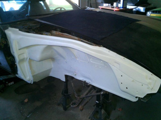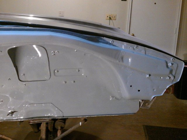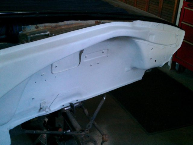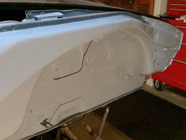 This weekend I got a coat of primer and paint on the wheel well. The first pics are the primer in white and the last 3 pics are the gray paint. -Dave