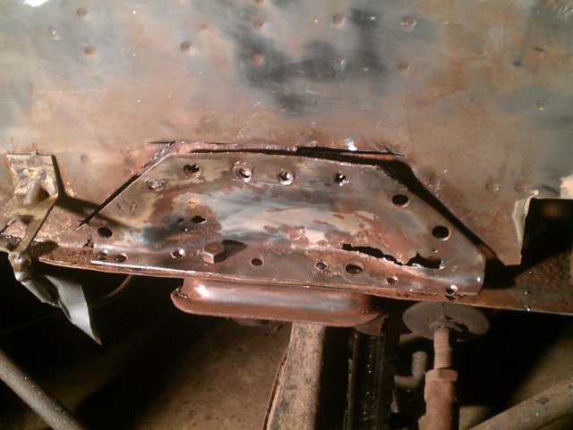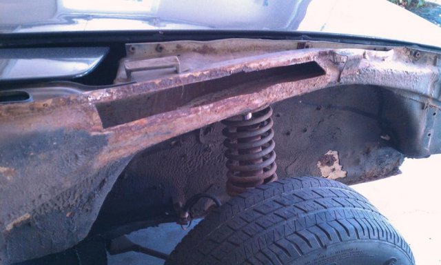 Its time to start working on the rust in the passenger side wheel well. Here is what it looks like with the fender off. More unanticipated rust. Looks like the prev. owner made a rust cover up for the top of the frame horn. Lucky me, more rust to fix. I now get to have fun scraping off all the undercoating. - Dave -