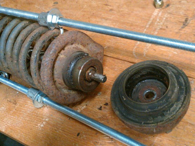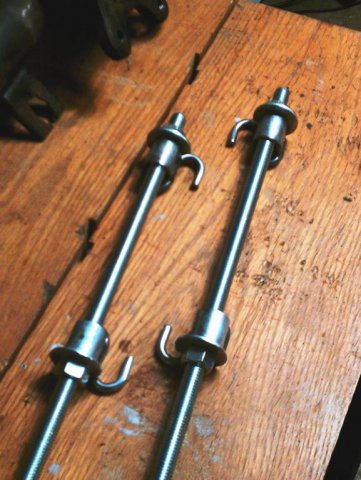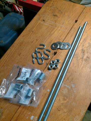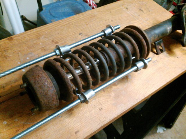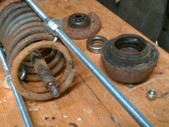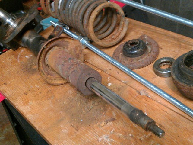 Time to clean up the strut. I started by wanting to make my own spring compressor. I just bought 1/2-13 all thread and some nuts and S hooks plus these sleeves at Lowes. All the pieces only cost me about $12. I welded the S hooks onto the sleeves. Now that I have the strut apart, I am going to sandblast everything. -Dave