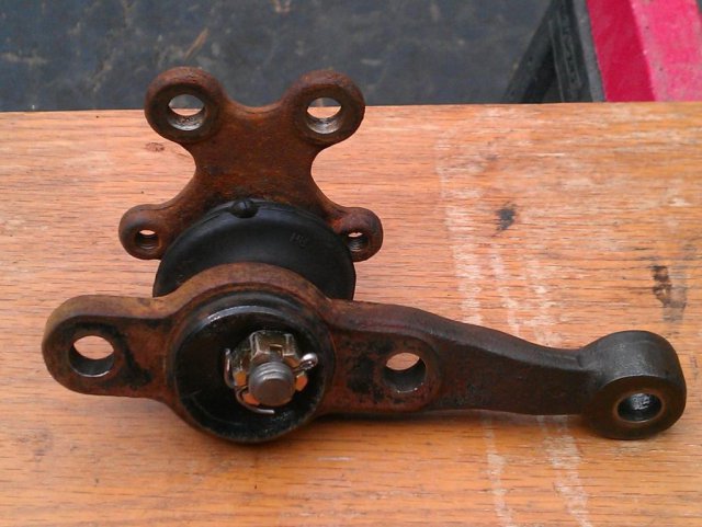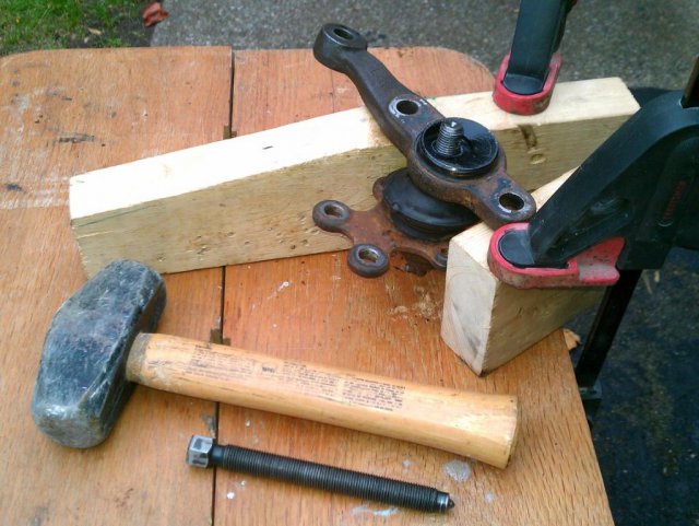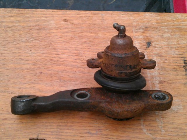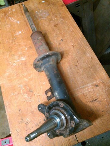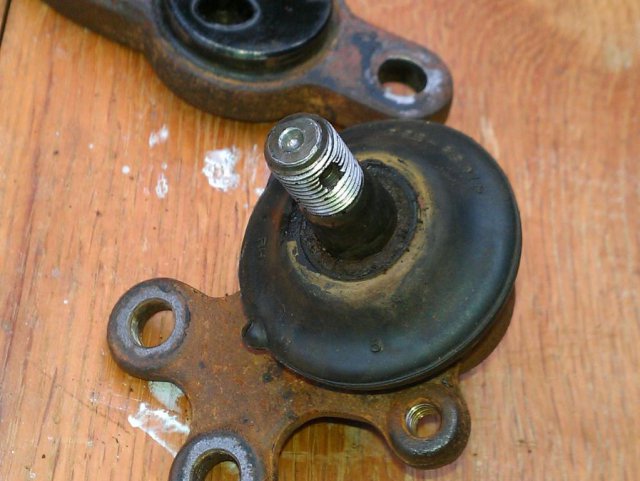 Now its time to start working on the strut and wheel assembly. This is the ball joint with the steering knuckle. Looks like the rubber boot has a tear in it. I couldnt seem to separate the ball joint from the knuckle. I tried using a wheel puller but the clamping surfaces were uneven and it wouldnt hold. I drilled a divot in the end of the bolt so a punch would stay on it and not damage it. Then I could punch it out. Success!! Now that its apart, I have to see about getting a replacement rubber boot. Also, I need to get it cleaned and painted. -Dave