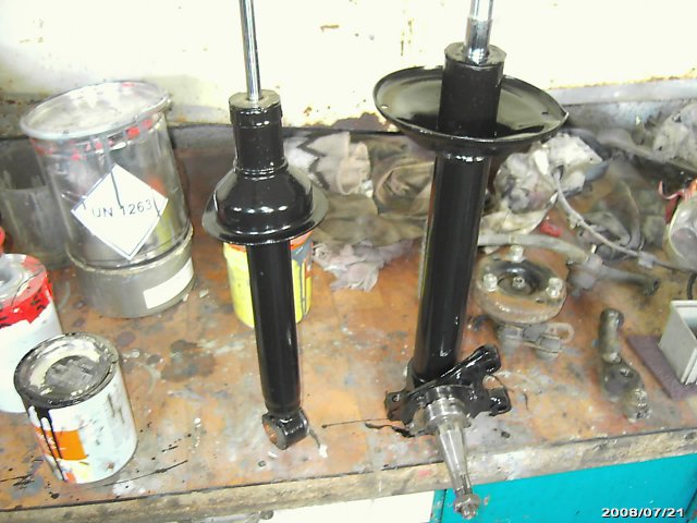 i got 2 cars, one broken and one for restoration. i decited to use the shocks with sticker "Monroe". they seamed to be newer and better. so i sanded it and paintet is black (left one) the right one was in my car, which i restored. Now I think this is OEM 280zx one?! -