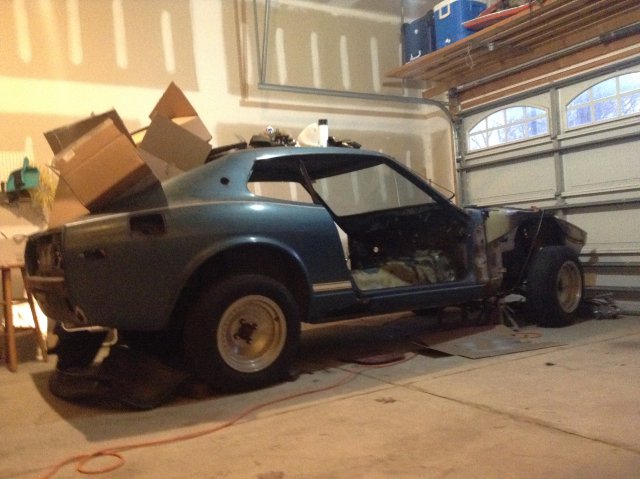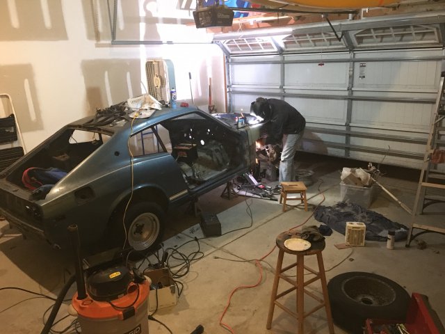 This is a build thread to document the progress on a 1977 Datsun 280z 2+2. The previous owner had started stripping the car with intentions of restoring it but it ended up just sitting in a storage container. Before that, the car sat in someone's yard because of a lien against it and eventually a tree fell on the back portion busting out the rear glass and leaving a nice dent. Because the car has been sitting for so long, it has a bit of rust but nothing structural, like the frame rails, is damaged. We've never done any car restoration work before so any pointers would be appreciated. The long term goal is to swap a LS v8 engine (probably a 5.3L or 4.8L), upgrade the suspension and brakes, and have a solid daily drivable Datsun. Below is a list of what we have done to the car already: -Stripped the interior and exterior -removed the sound dampening material with some freeze spray and an air chisel -removed the engine, transmission, and engine bay wiring -misc metal work (cutting out the usual Z rust and welding in patch panels) -coated all internal frame rails and cavities with east-woods internal frame rail coating or POR-15 Here is what we started with. Inspiration / Goals Pulling the engine - relatively easy. When you don't have a load leveler, you just use screw drivers to make sure the chain doesn't slide! Hopefully, the steering rack will be salvageable. Cutting out the rust (floor pans, battery tray, and a big spot in the bumper area) Here's some of the welding / patch panels. We used weld through primer so the the welds won't rust through. Battery Compartment The front nose area - patched on both sides driver's side floorpan (not nearly as bad as passenger side just one patch panel near the seat mount). Passenger floorpan - we fabricated a floorpan that was mainly plug welded in place and also replaced a rusty spot in the trans tunnel. a shot of some POR-15 rust convertor work underneath the cowl panel. That brings the project up to present time, lots of work to do still.