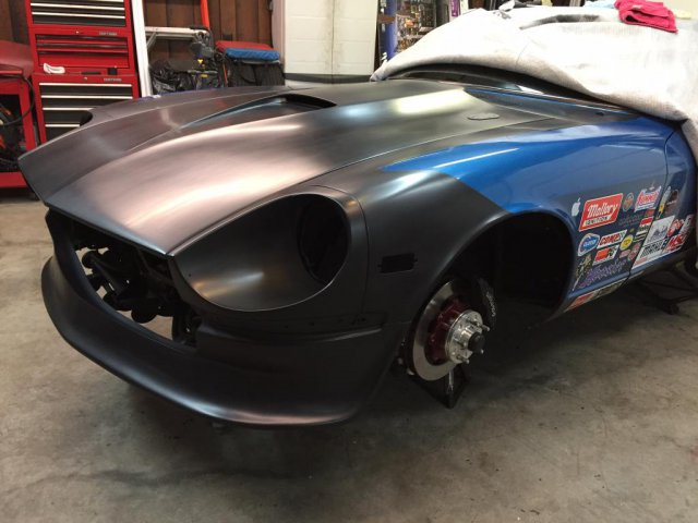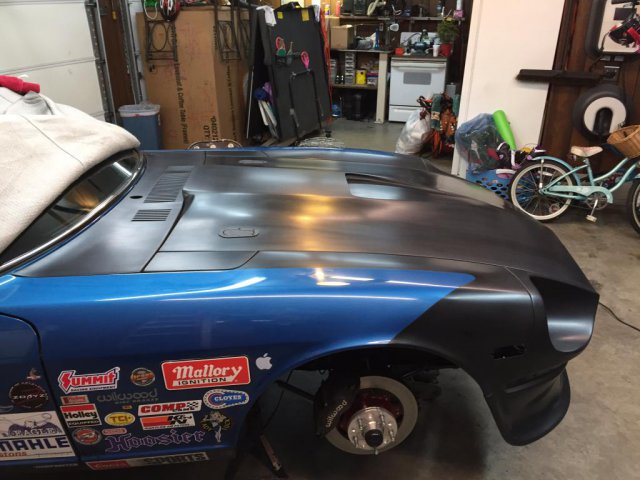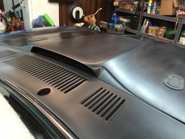 After a lot of work, I have finally got a cowl hood installed on my 280Z and wanted to share the results. Note: this hood is not a bolt on. Modifications were made to the front and rear of the scoop (personal preference), the front of the scoop was cut out, all four corners and the rear/back edge were glassed and shaped for improved body lines. The bracket attachment tabs were drilled, cut and spacers used to center the hood. I also cut material from the rear cross brace and filled with expandable insulation to add strength. I cut the material for a cleaner look and improved opening for cowl induction airflow. A lot of hours sanding, cutting and shaping gave me the rusults in the post. The paint is a brushed flat black from a 'rattle' can. The hood was purchased from Robert through 280Zone@cox.net