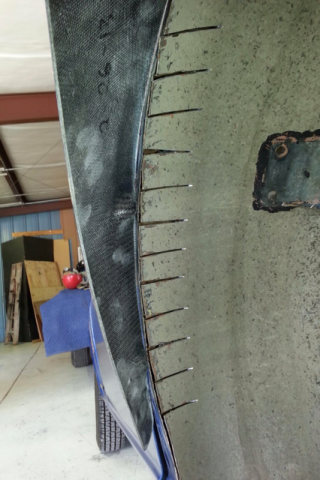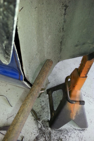 I am trying to fit 28X10.5" slicks under my 240z. I spent a lot of time talking to folks who have installed screw-on flares only to have to re-cut due to not cutting enough the first time. I put them high-higher than most (and I hope I like it), but I got to this point working with MiKelly who cut a tire road racing and had to re-cut at least once. The top of the flare is 4" below the hard bend in the quarter panel near the rear of the quarter window. The following are photos from the hot rod shop doing the metal work for me while I'm out of town. The metal man is being great about sending me photos. This is not a custom car, this is a race car, so I'm interested in not cutting a tire. I do not offer these photos as the best way to install flares; rather I only hope to share what I have learned and what I'm doing. I forgot to take my slicks to the metal man for test fit, so that has me stalled for now, but I called back from vacation and a good friend is delivering them in the morning. I need a lot of metal taken out of the dog leg section. I will include a photo of my car squatting on launch wearing 26X8.5 slicks-note how close the tire is to the dog leg. Test mounting the big slicks should answer the question of whether he has removed enough, or if I need him to remake the forward portion of the wheel tub/inner fender. SunnyZ solved this clearance problem by totally redesigning his rear suspension to move the tire rearward 1 full inch. I'm not about that. If push comes to shove, I will go to 27" slicks, but there isn't a lot available in that diameter. More photos when I have them. I made one obvious mistake in locating my flares but I'm pushing forward. When you test fit your flares, make sure the car is level. I test fit with the rear of the car high on jackstands and the front tires on the ground and used a plumb bob to locate the center of the flare over the center of the hub. That resulted in a flare that is rotated rearward somewhat once the car is on level ground. I wish the front of the flare was farher down, but I'm moving on. I will try to stick with the small screws that come with the Z-force Productions flare mounting kit and delay the placement of rivet nuts (which puts a BIG hole in the sheet metal). I may be looking at a paint job this winter (especially if the welding burns my paint up terribly), in which case, I will have the current small holes welded and then rotate the flare and redrill it as it should be.
