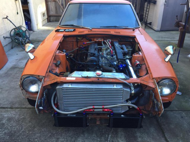 Hi all, I've finally decided to crawl out of my cave and surface my build here. I felt like I was taking more from this forum than I was giving. My build used a TON of info that I was able to unearth via this site. My hope is that my build adds to the plethora of information on here and helps others as much as it has helped me. Anyhow, I've been trying my best with the limited network/connections I have to get suggestions on where I should start with jetting for my turbo surge tank set up. I feel like I hit a dead end. I know that I have to fine tune the jetting for MY set up...so I'm currently in the process of installing a wide band O2 sensor and a boost gauge. However, does anyone here with experience have a ballpark estimate on jet sizes in an application like this? I don't want to start tuning my engine and have it catastrophically fail or damage my newly rebuilt motor because my jets are way out of line. Here is my set up: Engine: L28 N42 Block E88 Head (Debating on whether or not to install my spare P79 head in) 280zx Turbo dished pistons .020" oversize 1mm headgasket Stock L28 rods 280zxt stock exhaust manifold Custom 2.5" to 3" turbo back exhaust T3 Turbo w/internal wastegate: Compressor: Trim:55 Inducer Diameter:50.5 mm Exducer Diameter:76 mm A/R:0.5 Turbine Trim:73 Inducer Diameter:65.5 mm Exducer Diameter:55.9 mm A/R:0.63 Triple Mikuni 40PHH Carbs Main Jet: 145 Main Air Jet: 200 Pilot Jet: 60 Pump Nozzle: 0.45 I was able to find one member on here who ran a similar set up with a bone stock N42 block/internals 20+ years ago. He ran a 145 main jet. However, I was not able to find out what size his air correctors were. Any suggestions on baseline jet settings for a set up like this? Or am I just on my own with my O2 sensor analysis? I have included pictures for you! Please excuse the mess, it's still under construction. Thanks in advance!