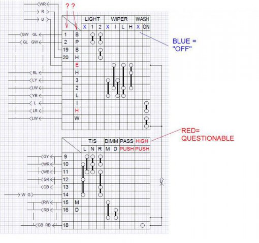 I've done quite a bit of searching, but have not come up with an answer to this... I have a 73 240, I have the factory service manual, as well as the downloadable version that someone was nice enough to post on a different site. Here's my questions: The FSM wiring diagram for a car with a manual transmission (page BE-5) shows Fog Lamps, which I understand was not a U.S. option, so I am not surprised to find no wiring for them in my car, but the diagram also shows "step lamps" (right and left hand), which I can't find any evidence of my car having. I am assuming that these were not a U.S. thing either. I am wondering what else this wiring diagram is showing me that does not exist on a US spec car. Does anyone have any insight on this? Here's another thing, I am trying to decipher what the diagram is showing me for the combo switch/turn signal switch. My manual is a little blurry on some parts of that "chart". I have redrawn it (see attached graphic) with the questionable bits in red, and I put blue X in place of the word "off" (since the word was too long to fit in my graphic). Also, does anyone have any idea what the numbers in the left column are for. I'm thinking the letters in the second-to-the-left column must relate to things like H=high, L=low, I-intermittent, etc. but some of those letters are not making sense to me. With all the electrical topics discussed on this site I'm kind of surprised that there isn't a dedicated electrical section!